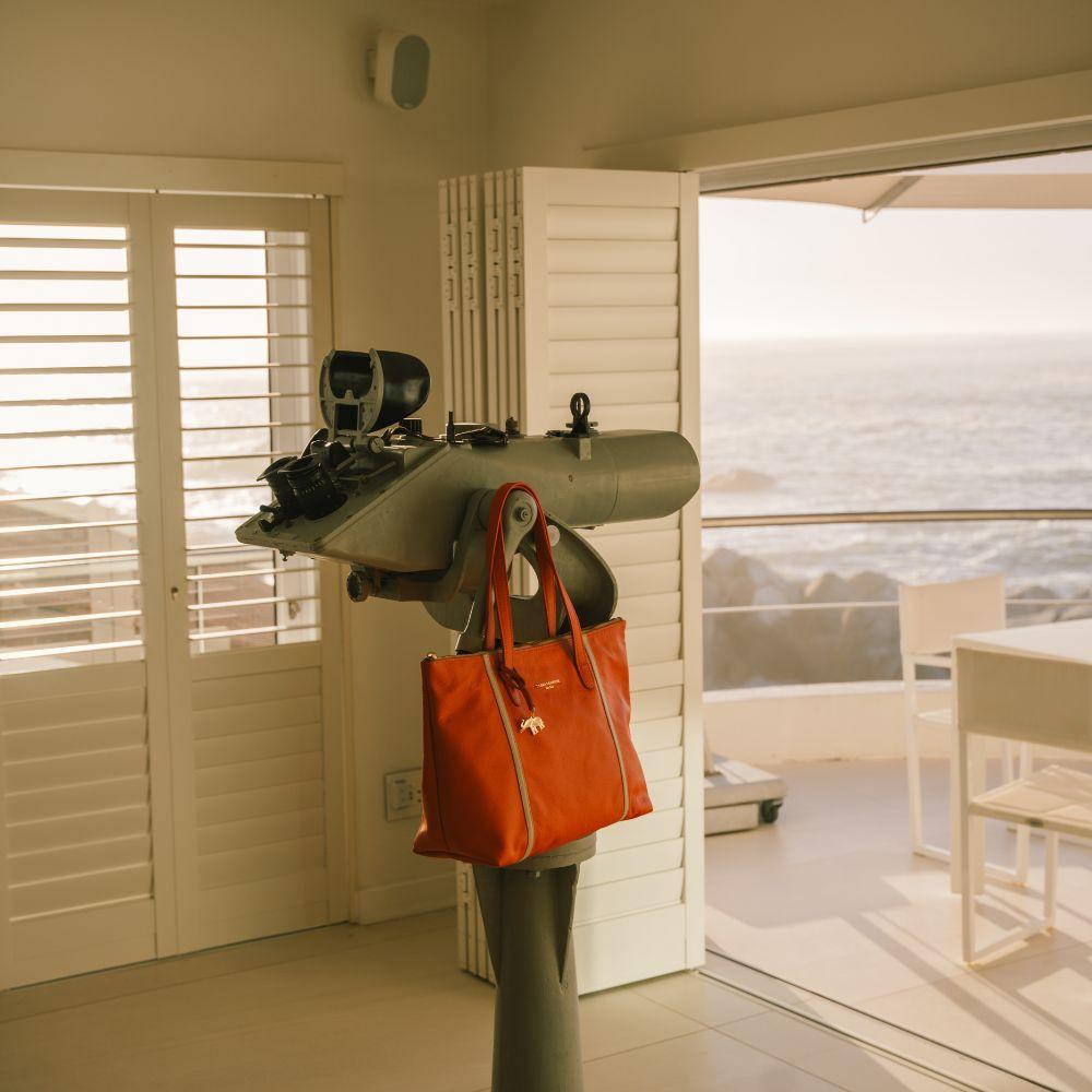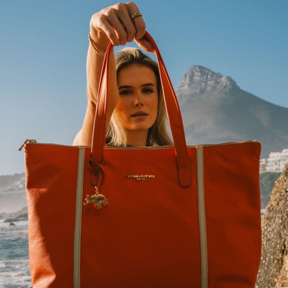 Our ultra-light weight signature tote bags in orange and cream are crafted with 100% genuine leather which is of the utmost quality. It includes our signature printed animal lining that is carefully stitched inside the main zipped pouch to add our unique touch. The bag is fitted with gold finishes and a small leather pouch inside the main zip for functionality. This bag is perfect for everyday use, big enough to hold all the essentials yet still presents that light and elegant style.